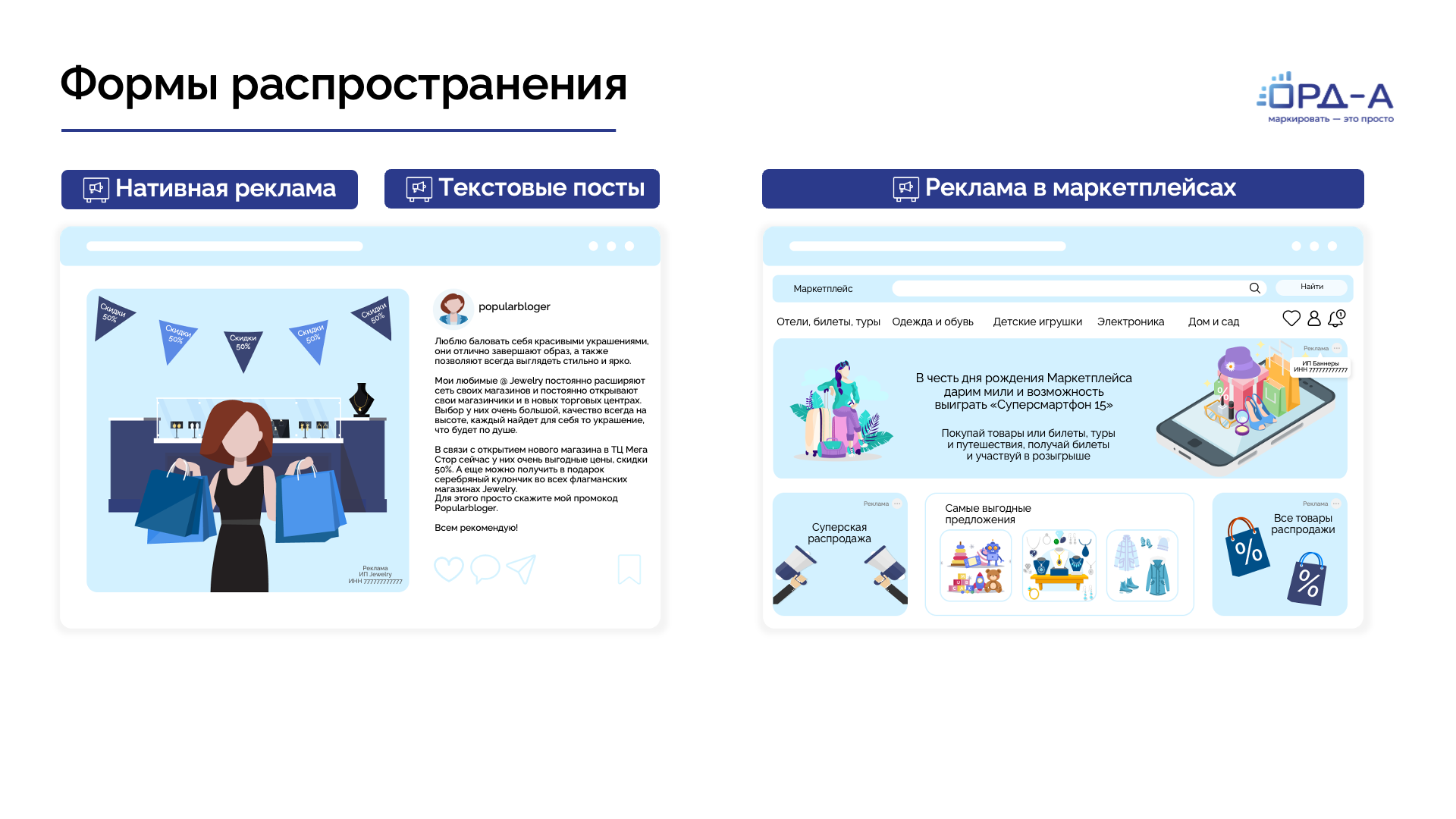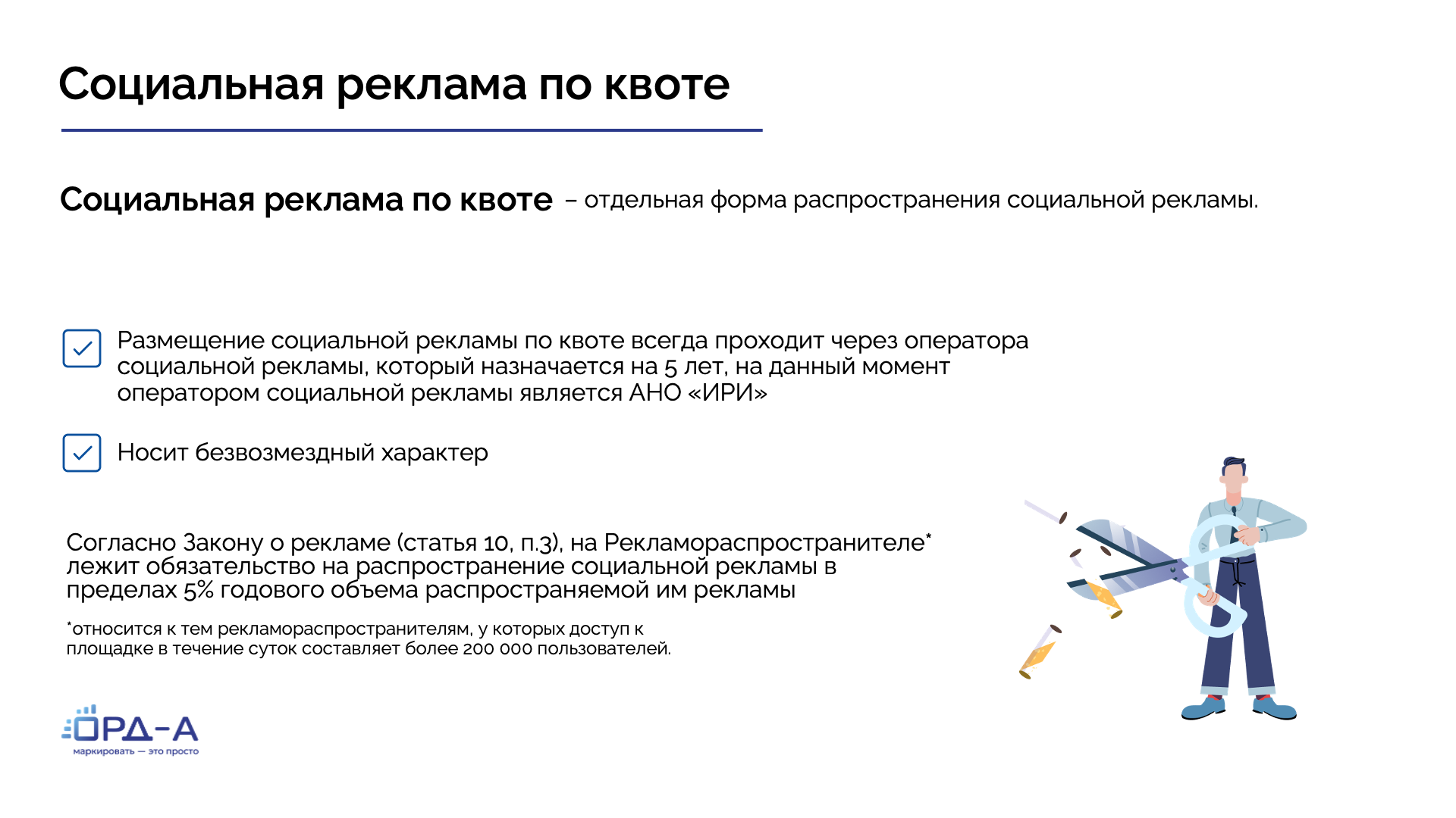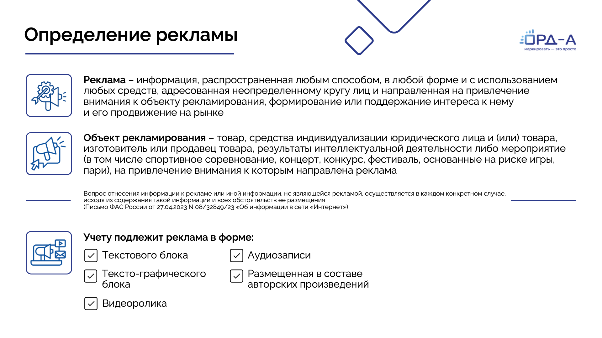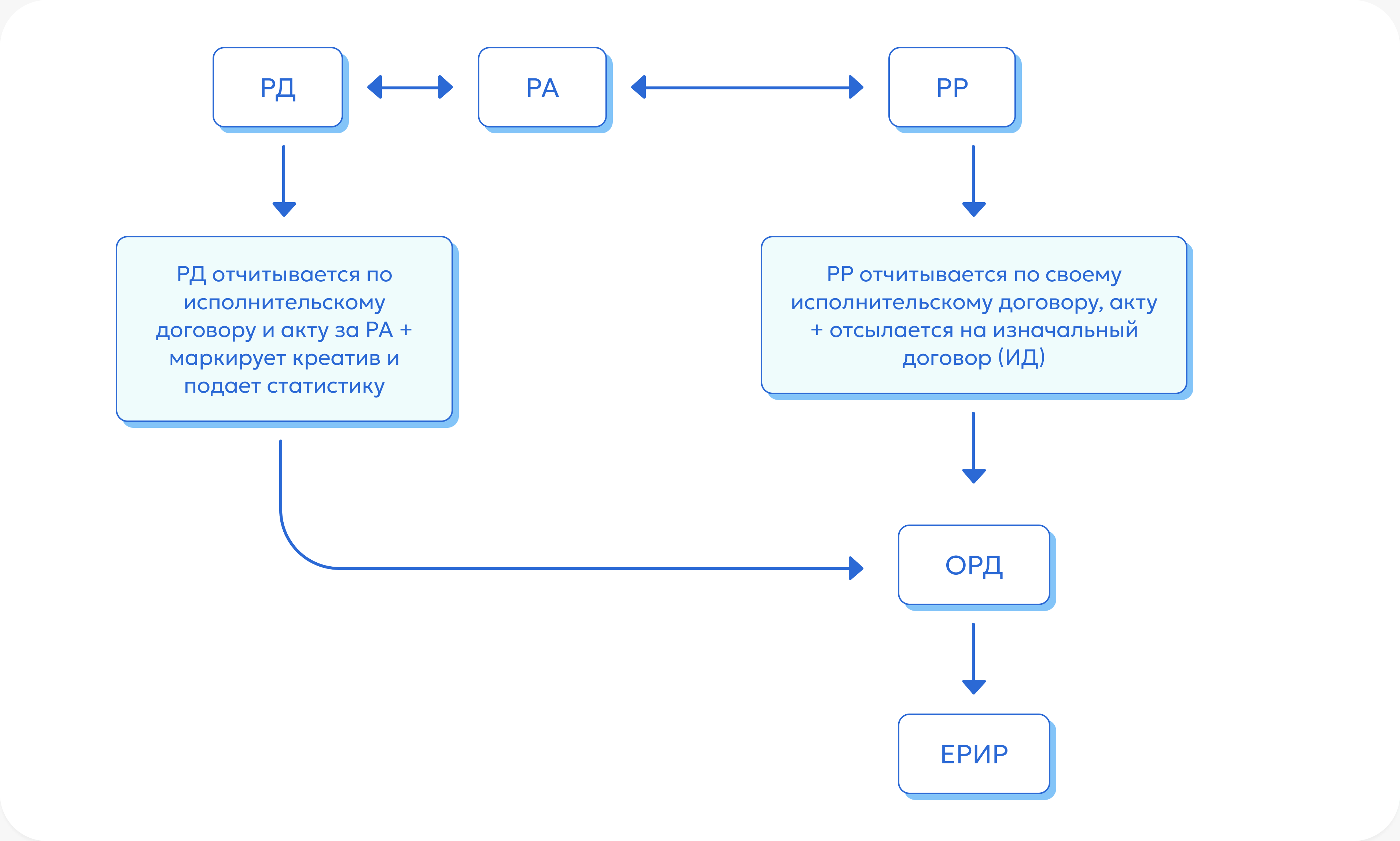 С 1 сентября 2022 года введена обязательная маркировка рекламы. Теперь перед размещением вся реклама в интернете должна быть промаркирована согласно нововведениям в Федеральном законе «О рекламе». Для этого были введены специальные участники – Единый реестр интернет-рекламы (ЕРИР) и операторы рекламных данных (ОРД), например, мы – «ОРД-А». Мы помогаем упростить маркировку и передачу данных в ЕРИР, агрегируя информацию от участников рынка и присваивая идентификаторы рекламным материалам. Напрямую направить сведения о рекламных кампаниях в реестр нельзя.