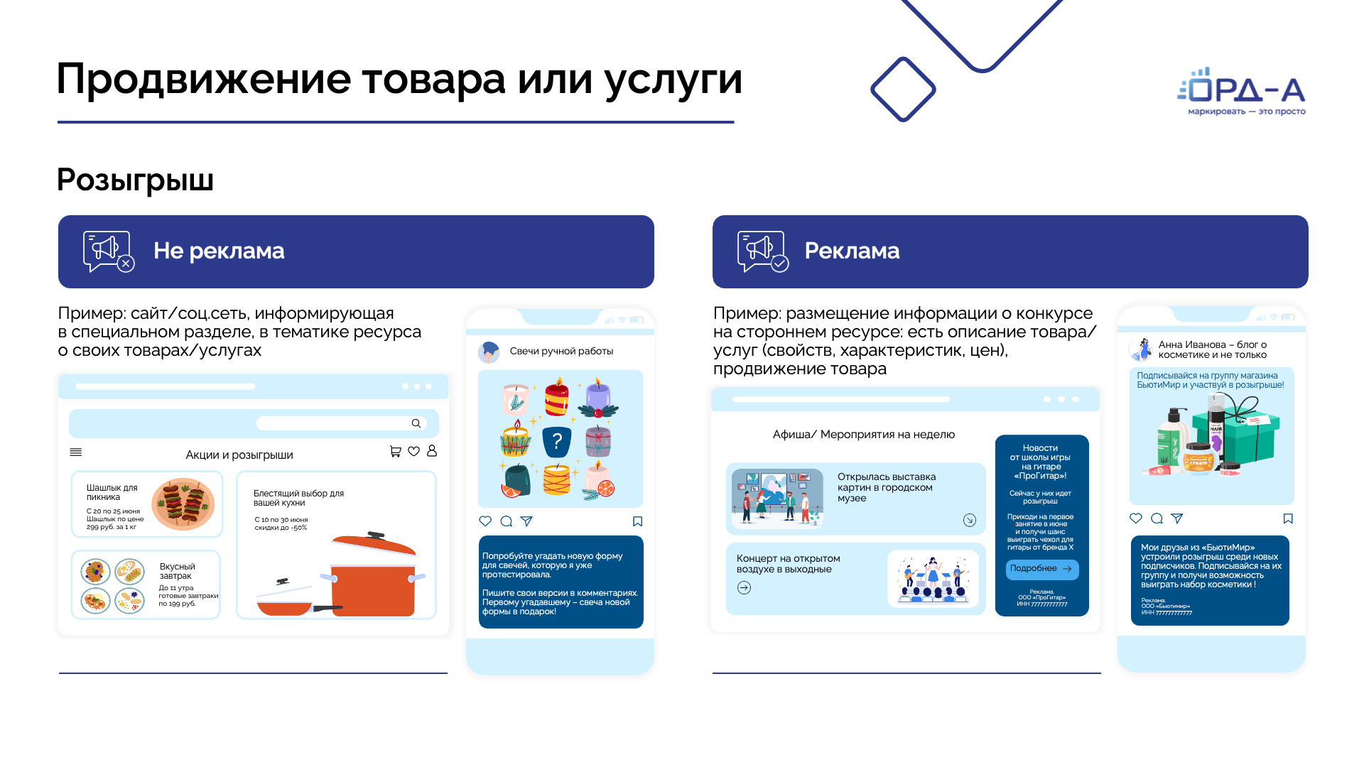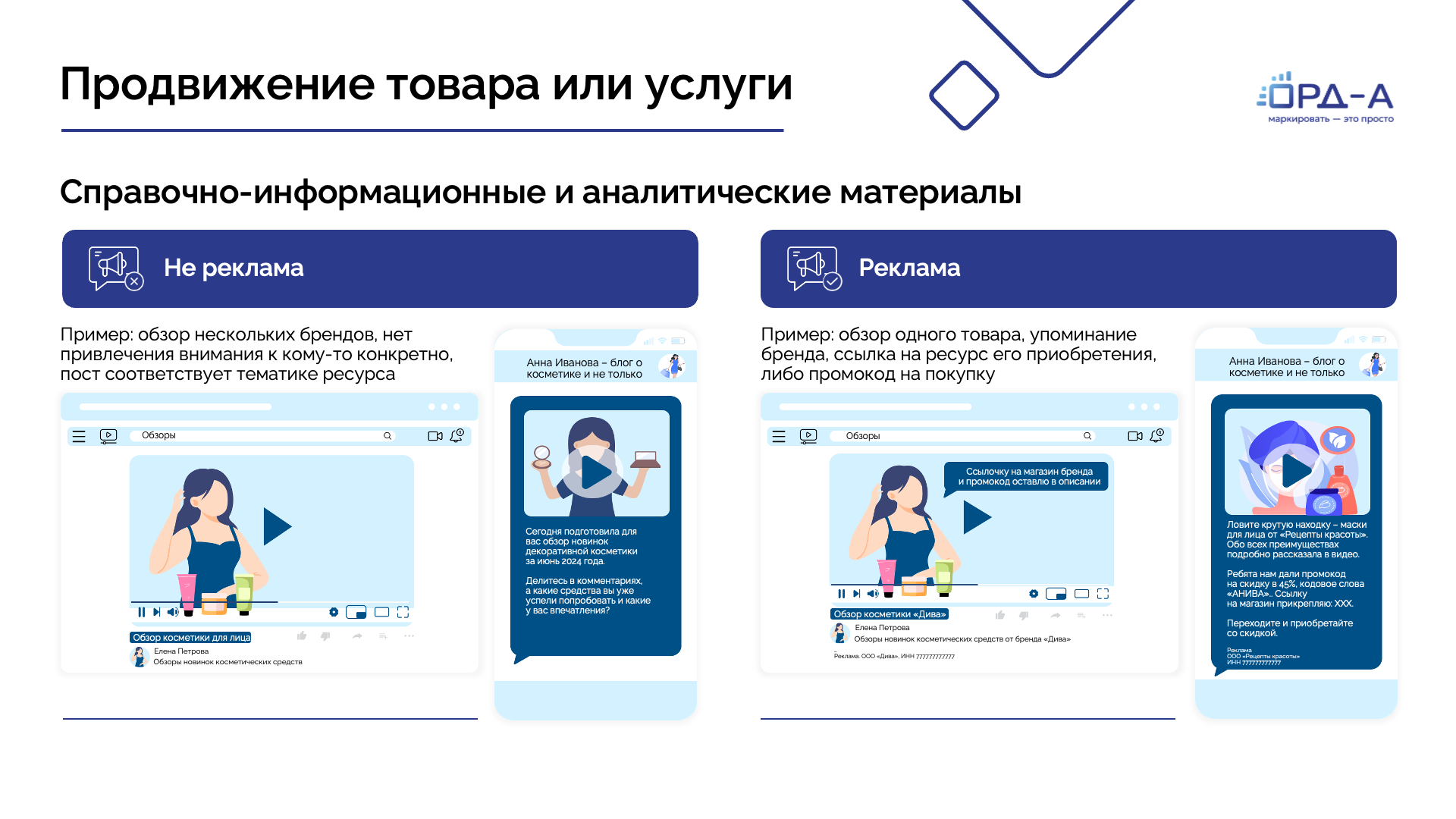 На данный момент в юридической практике рекомендуем обратить внимание на следующее: если у вас нет договорных отношений и услуг по рекламированию, то пост все равно может считаться рекламным. В этом случае нужно смотреть, как именно у вас размещается данная информация. Например, если у вас регулярно выходят подобные посты про разные ваши товары/услуги, то тогда это может быть информированием о своих товарах/услугах, то есть о своей деятельности. С другой стороны, если у вас такой пост с привлечением внимания к определенным продуктам вышел разово или это случается редко, то тогда это скорее реклама, которую необходимо маркировать.