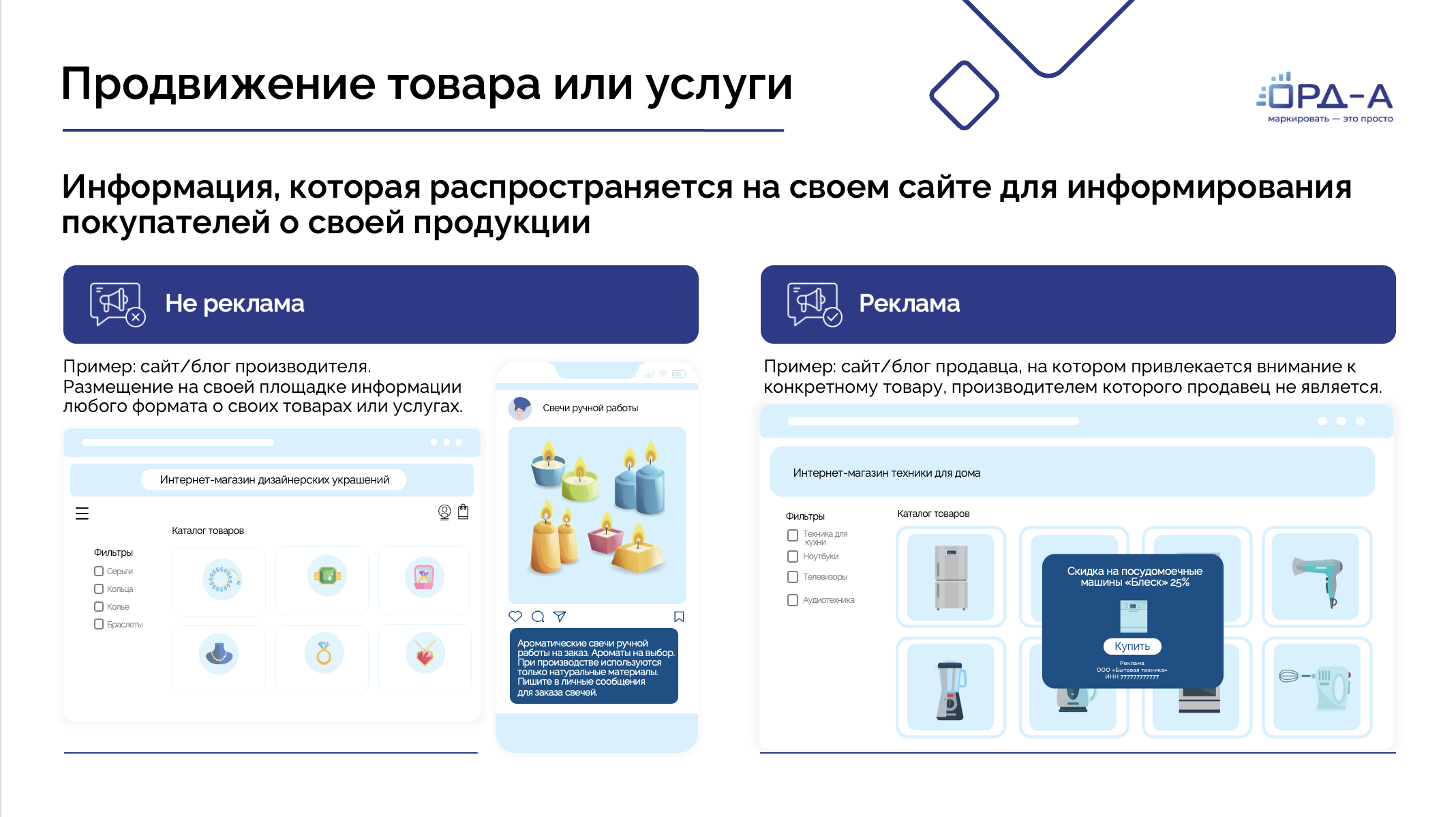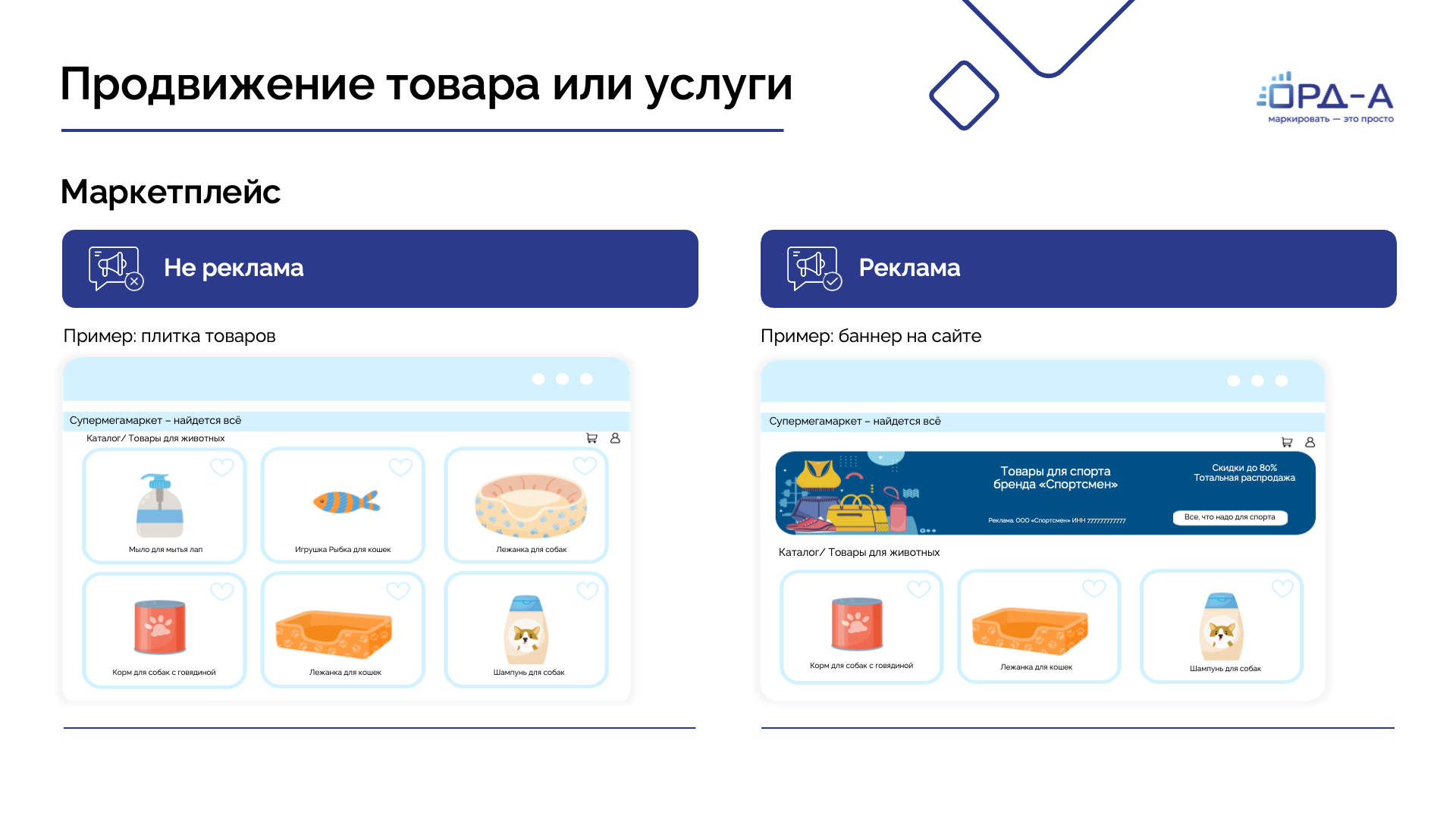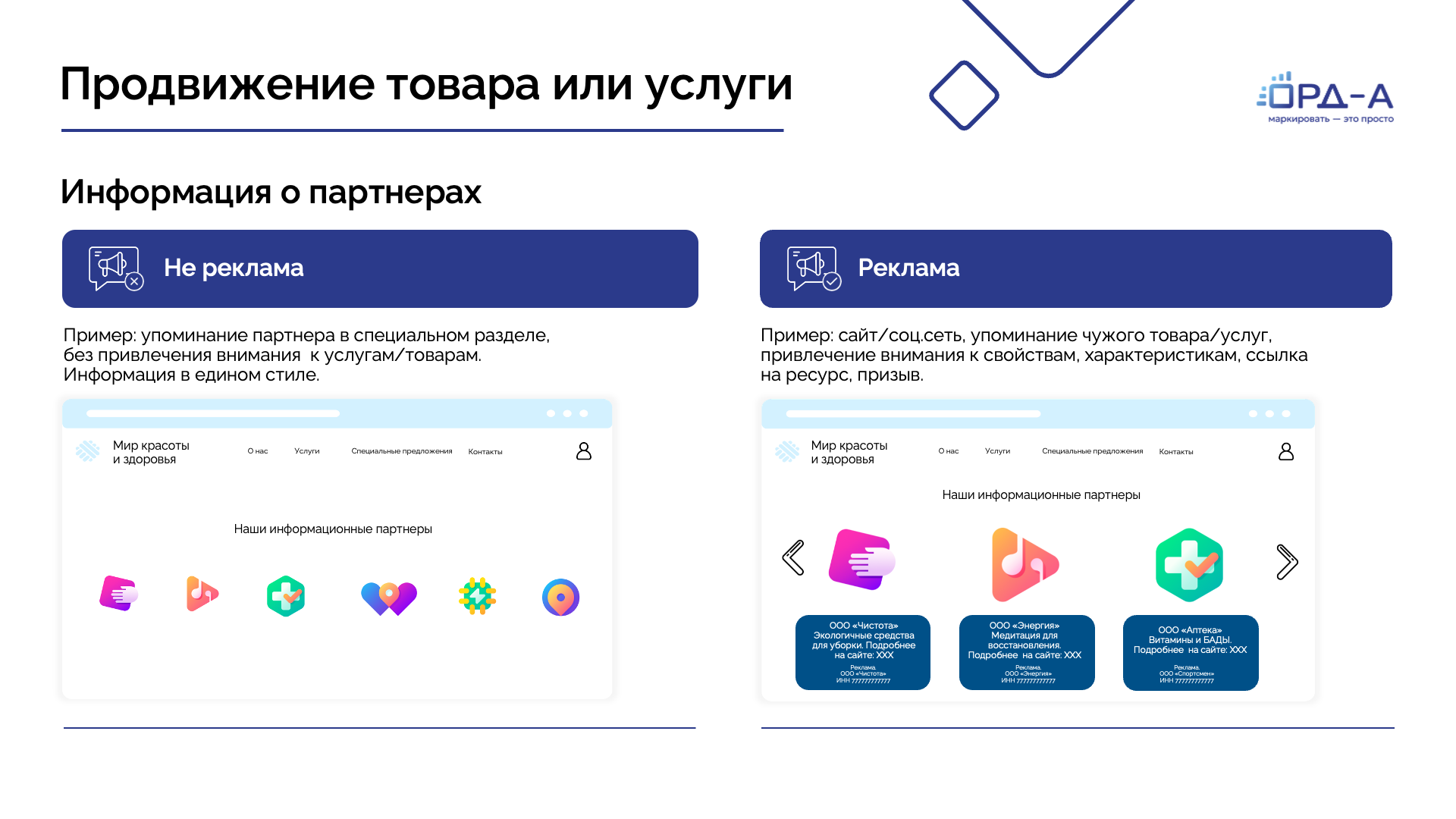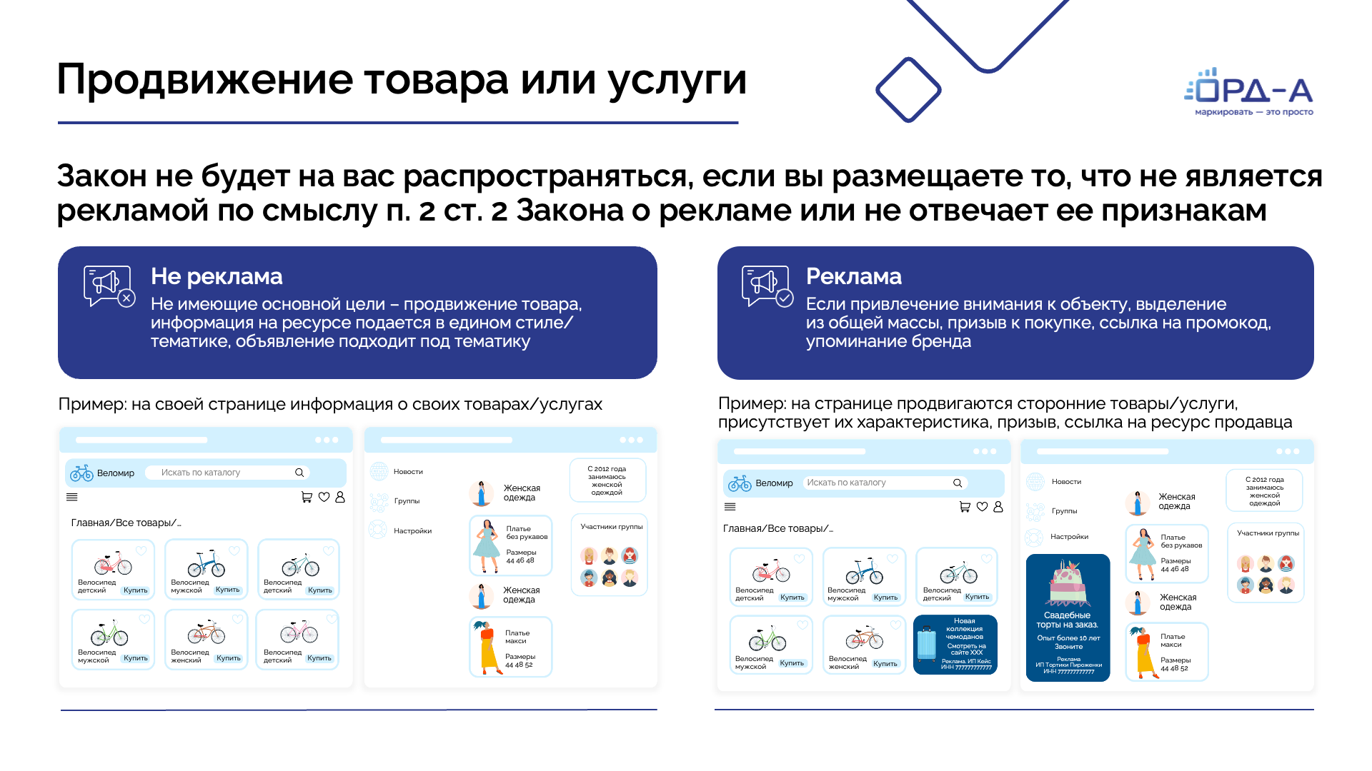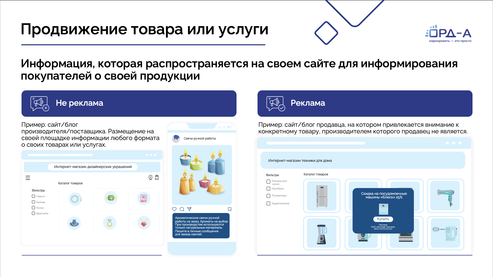 Информация о своих продуктах на сайтах производителей – по умолчанию не является рекламой. Информация на монобрендовых сайтах продавцов тоже не является рекламой, однако выделение одного бренда из множества может быть признано рекламой, которую необходимо маркировать.