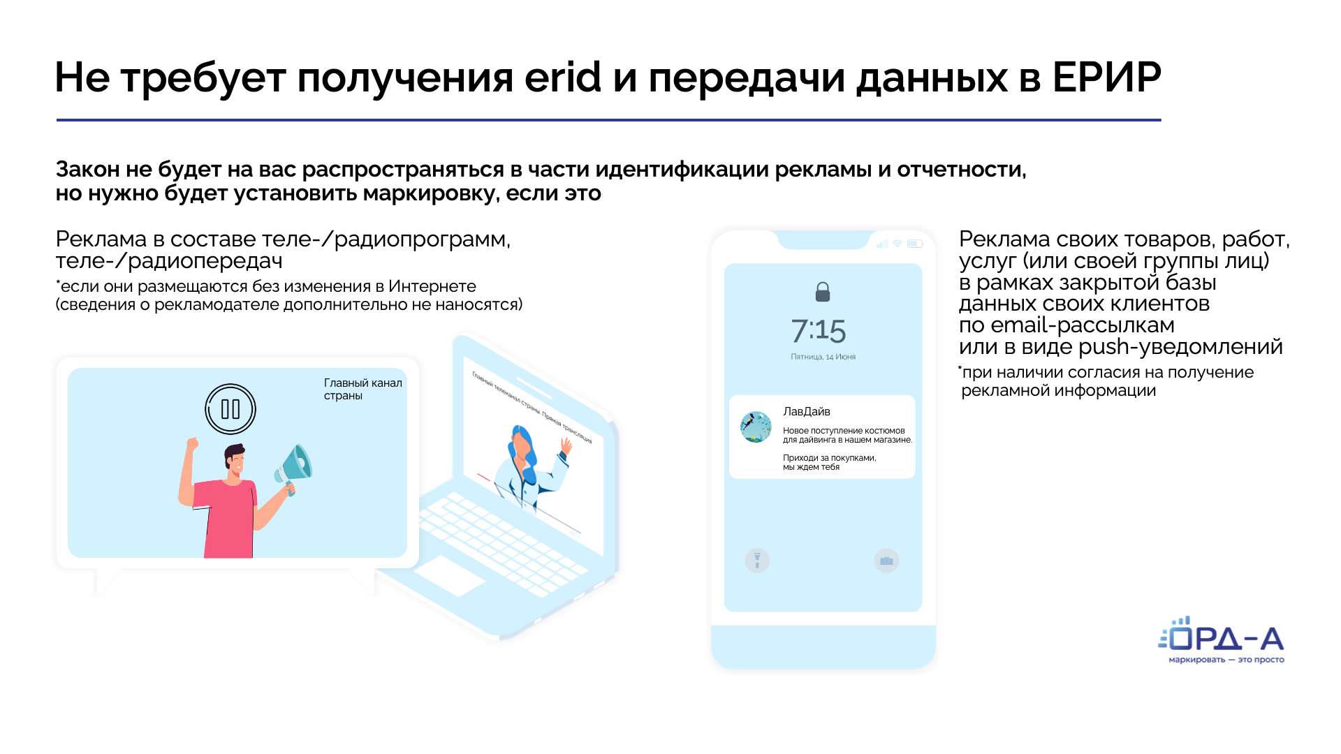 Требования ст. 18.1 Закона «О рекламе» о маркировке также не будут на вас распространяться, если вы распространяете сведения о рекламе в составе теле-/радиопрограмм, теле-/радиопередач, если они размещаются без изменения в Интернете.