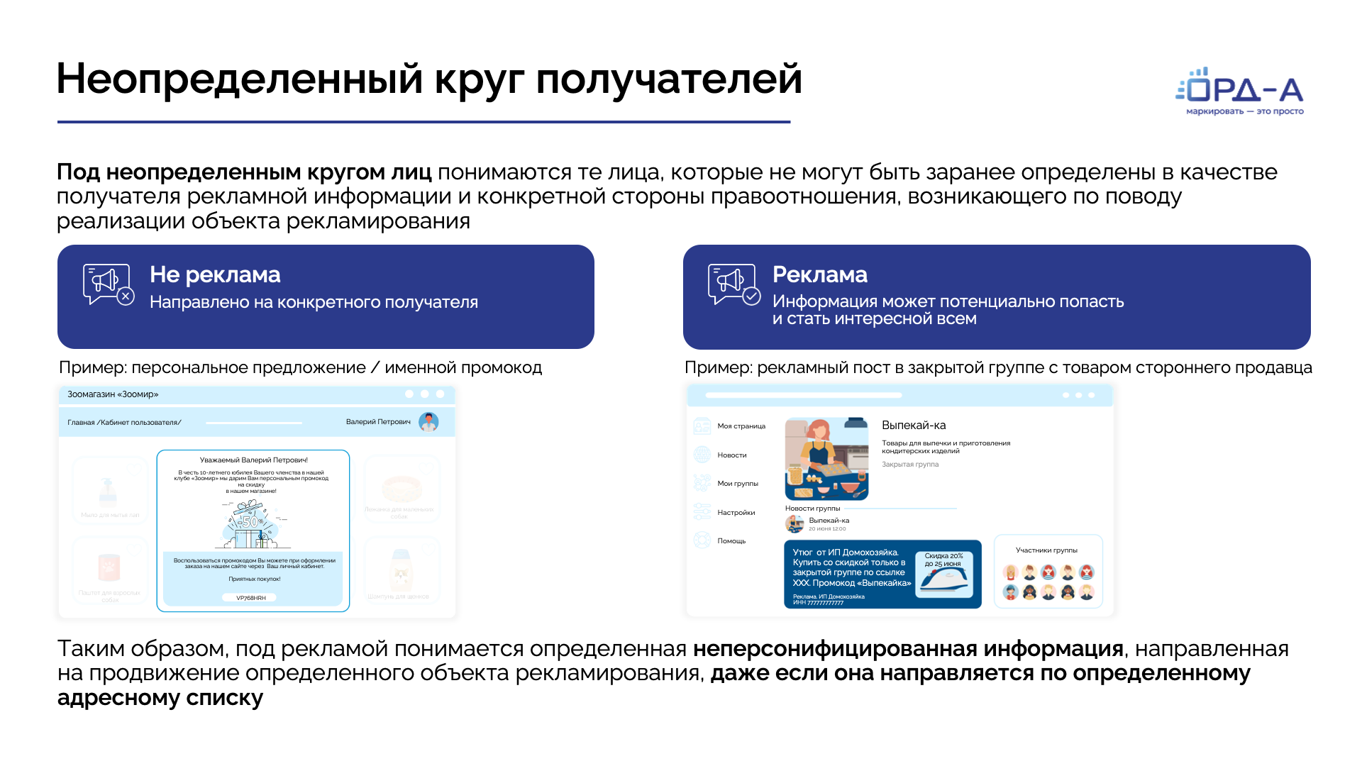 Информация в закрытых группах и приложениях (даже если в них нужно специально регистрироваться) может быть признана рекламой и подпадать под маркировку, если она носит рекламный характер и потенциально интересна любым лицам.