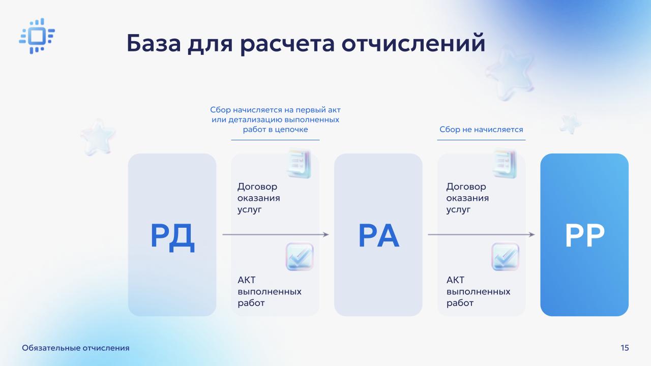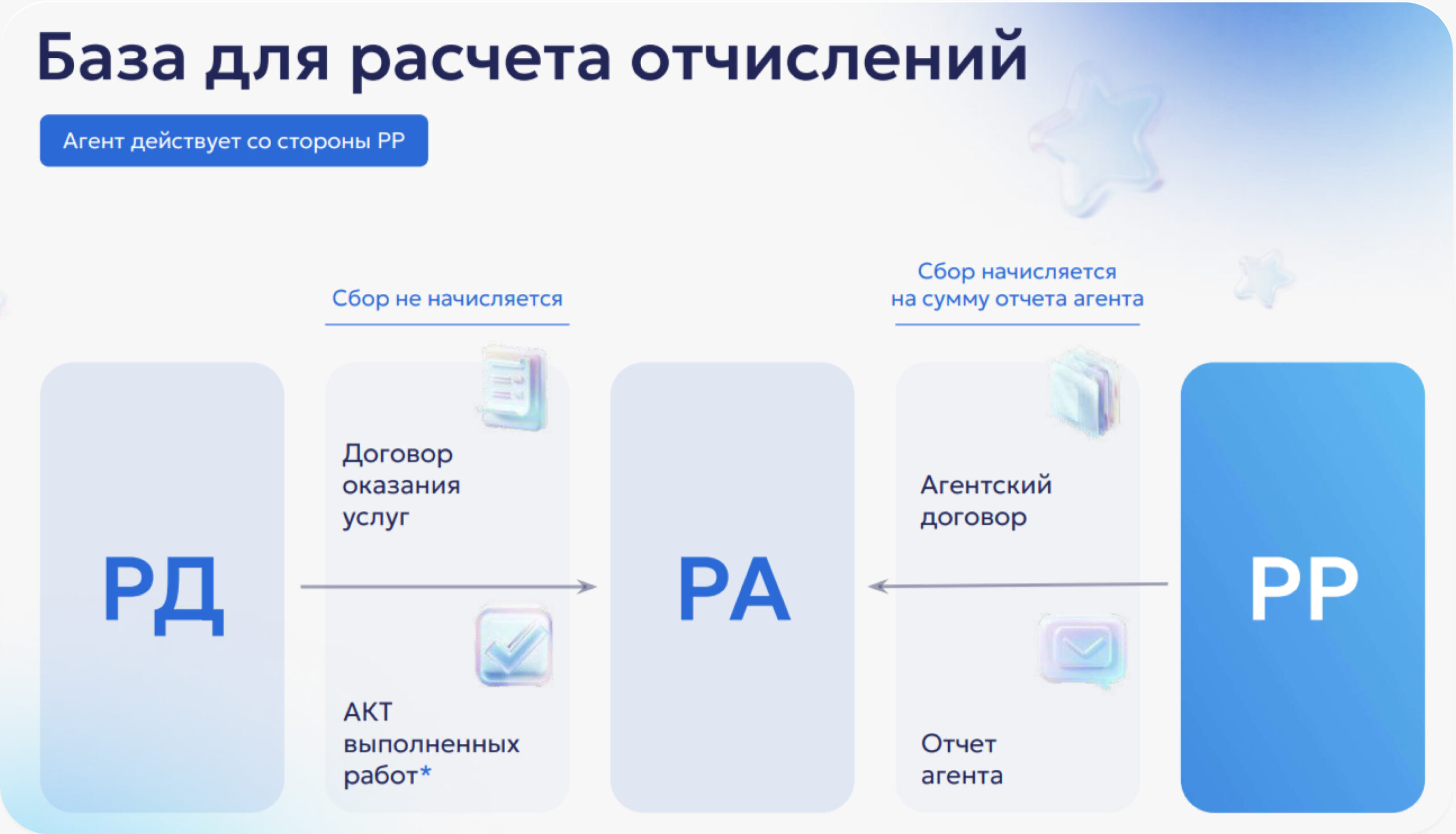 Пример (см. скрин выше): Между РД и РА заключен договор оказания услуг на 100 руб., которые РА транслирует в сторону РР и сбор с РА не взимается.