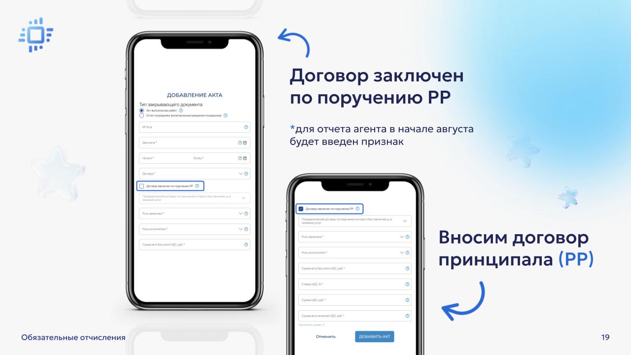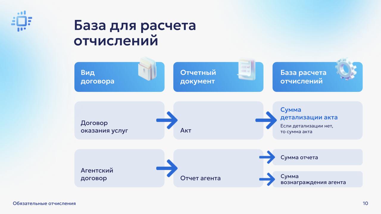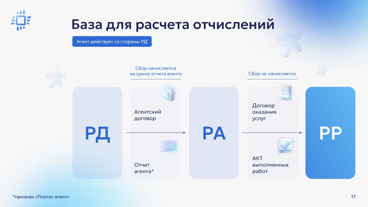 Пример (см. скрин выше): между РД и РА заключен агентский договор на 100 руб., из которых агентская комиссия составляет 10 руб., а стоимость размещения рекламы у РР – 90 руб., то сбор будет взиматься с суммы комиссии (10 руб.).
