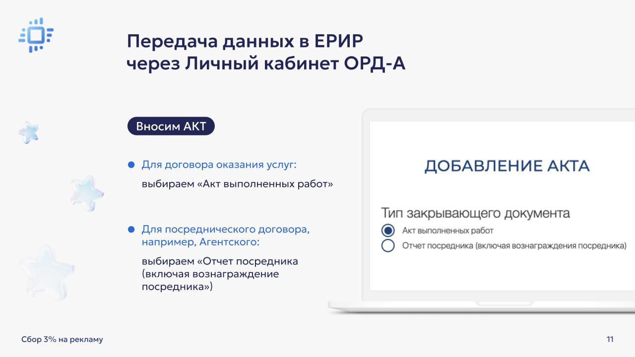 При маркировке данные обо всех участниках цепочки размещения интернет-рекламы должны попасть в ЕРИР и происходит это в два этапа: