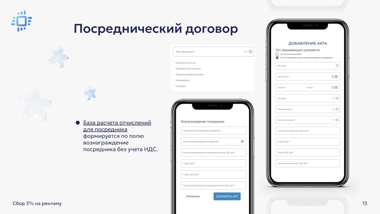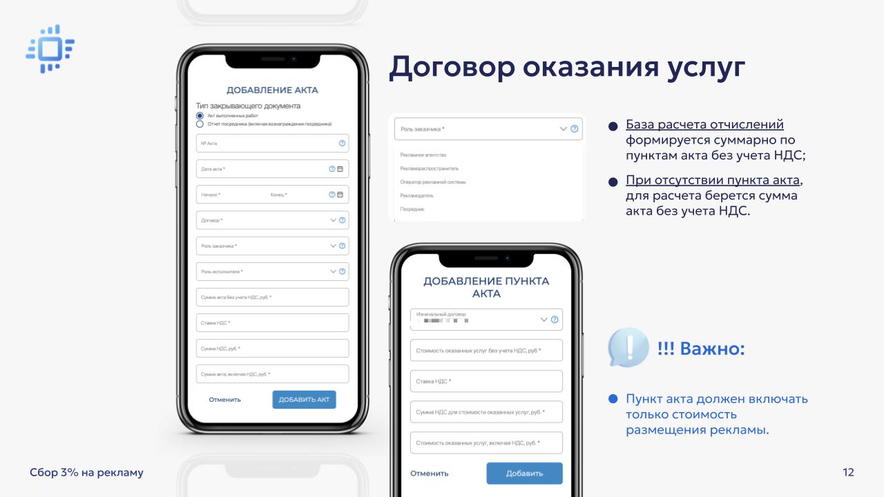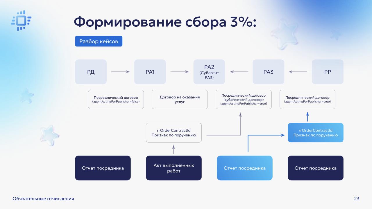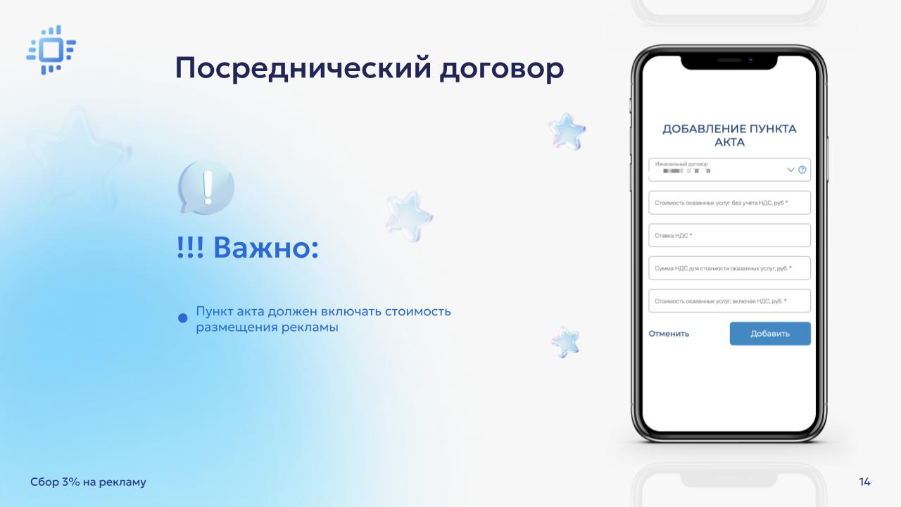 Пример (см. скрин выше): если между РД и РА заключен договор услуг на 100 руб., из которых по акту сумма рекламного бюджета составляет 60 руб., то в пункте акта (при разаллокации акта) указывается сумма 60 руб. С нее будет взиматься сбор 3%. При этом по договору РА-РР сбор не взимается.
