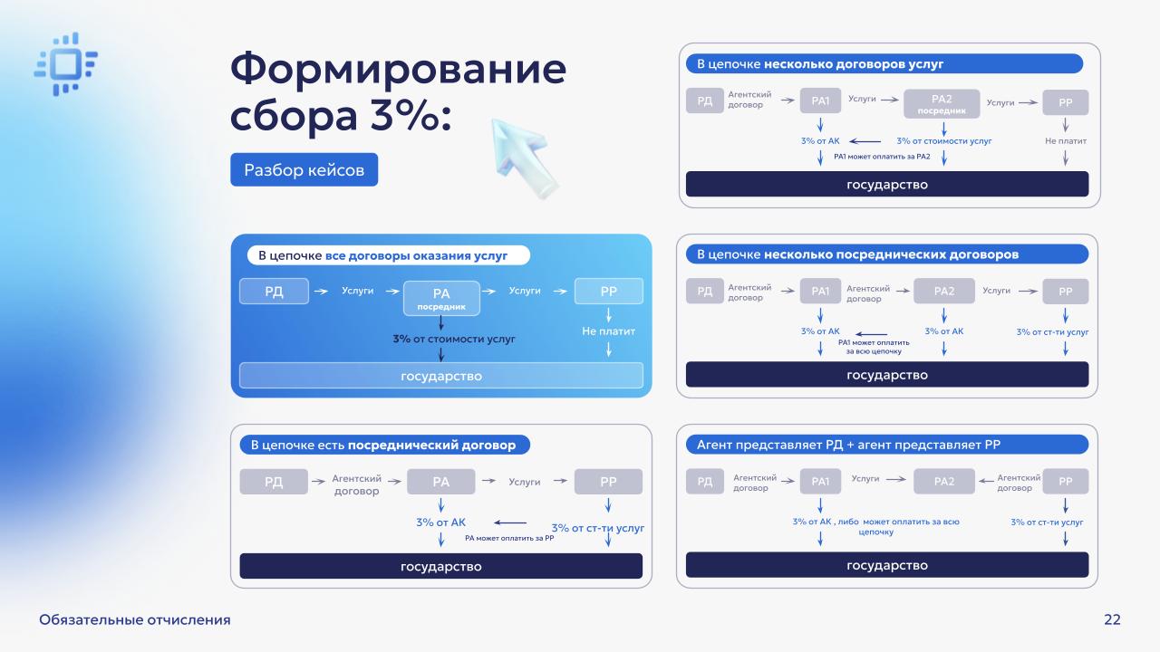 Если первый исполнитель, идущий в цепочке после рекламодателя (РД), работает по договору оказания услуг, то с него будет взиматься сбор в размере 3% от его дохода на размещение рекламы. В этом случае с последующих участников цепочки сбор не взимается.