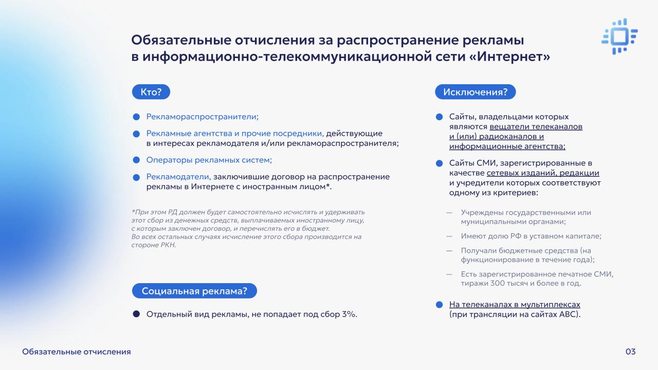 Согласно Федеральному закону № 479-ФЗ о поправках в Закон о рекламе, с 1 апреля 2025 года участники рынка должны будут платить сбор в размере 3% от квартального дохода за интернет-рекламу.