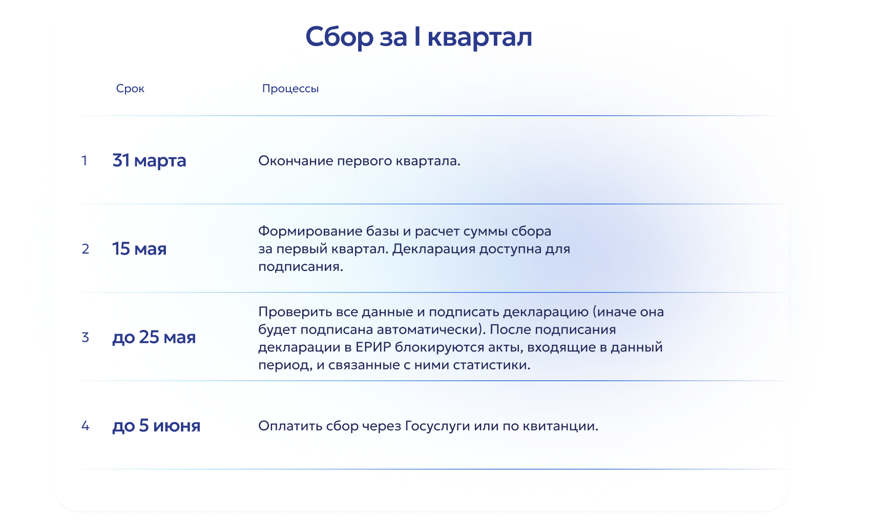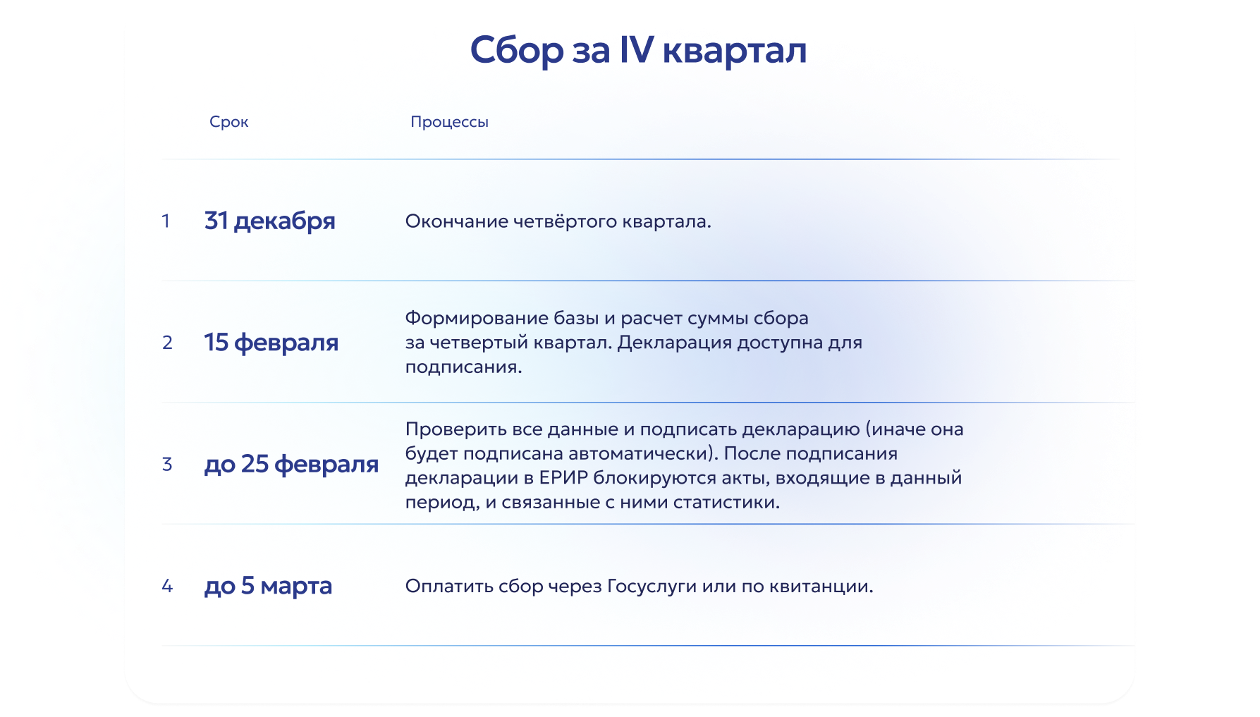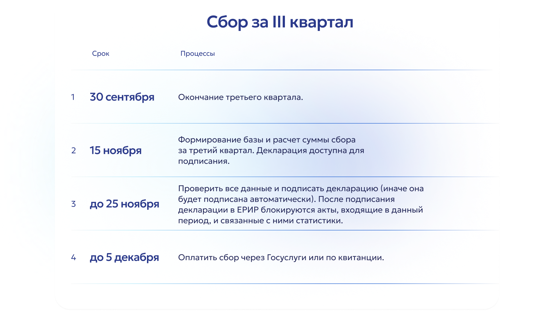 В течение нескольких дней после передачи данных о сделке их можно будет проверить в ЛК ЕРИР. После 15-го числа второго месяца следующего за кварталом формируется декларация, которая подлежит подписанию до 25-го числа. Оплата сбора должна быть произведена не позднее 5-го числа третьего месяца квартала, следующего за платежным периодом – через Госуслуги или по квитанции.